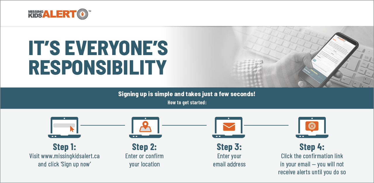 1. Start by signing up for MissingKidsALERT — our public notification service that alerts the public when a child is missing in their area and provides critical information in the search for the child.