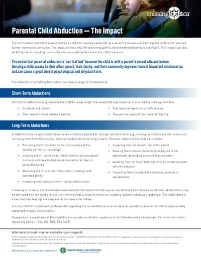 While most parental child abductions are resolved with the searching parent and the abducted child reunited quickly, they are harmful and traumatic events that may have lifelong impacts on everyone involved. For more information on the impact of parental child abduction, download the information sheet below.
