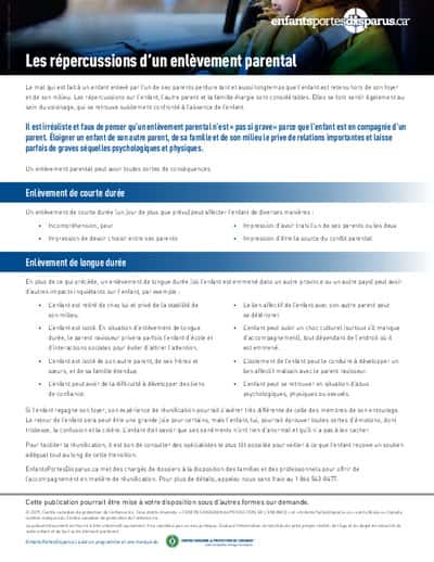 Dans la plupart des cas, l’enfant sera vite restitué au parent qui le cherchait, mais il n’en demeure pas moins que l’enlèvement parental est un épisode douloureux et traumatisant qui risque d’avoir un impact durable sur toutes les parties. Pour vous renseigner davantage sur l’impact d’un enlèvement parental, téléchargez la fiche d’information ci-dessous.